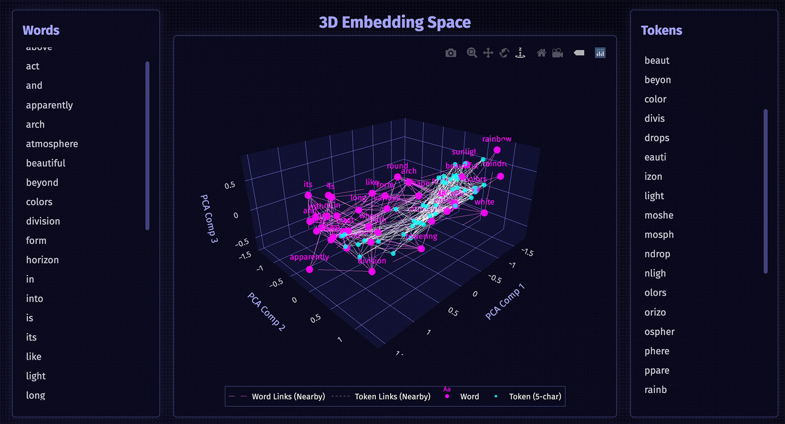 An experimental visualization exploring the relationship between human language and machine learning tokens. This interactive 3D graph demonstrates the concept of how a sentence, understood by humans through the association of words, can be deconstructed by an AI into a relational map of tokens. It's a conceptual look into how machines "see" language, finding patterns in token relationships in a way that is analogous to how humans find meaning in words.