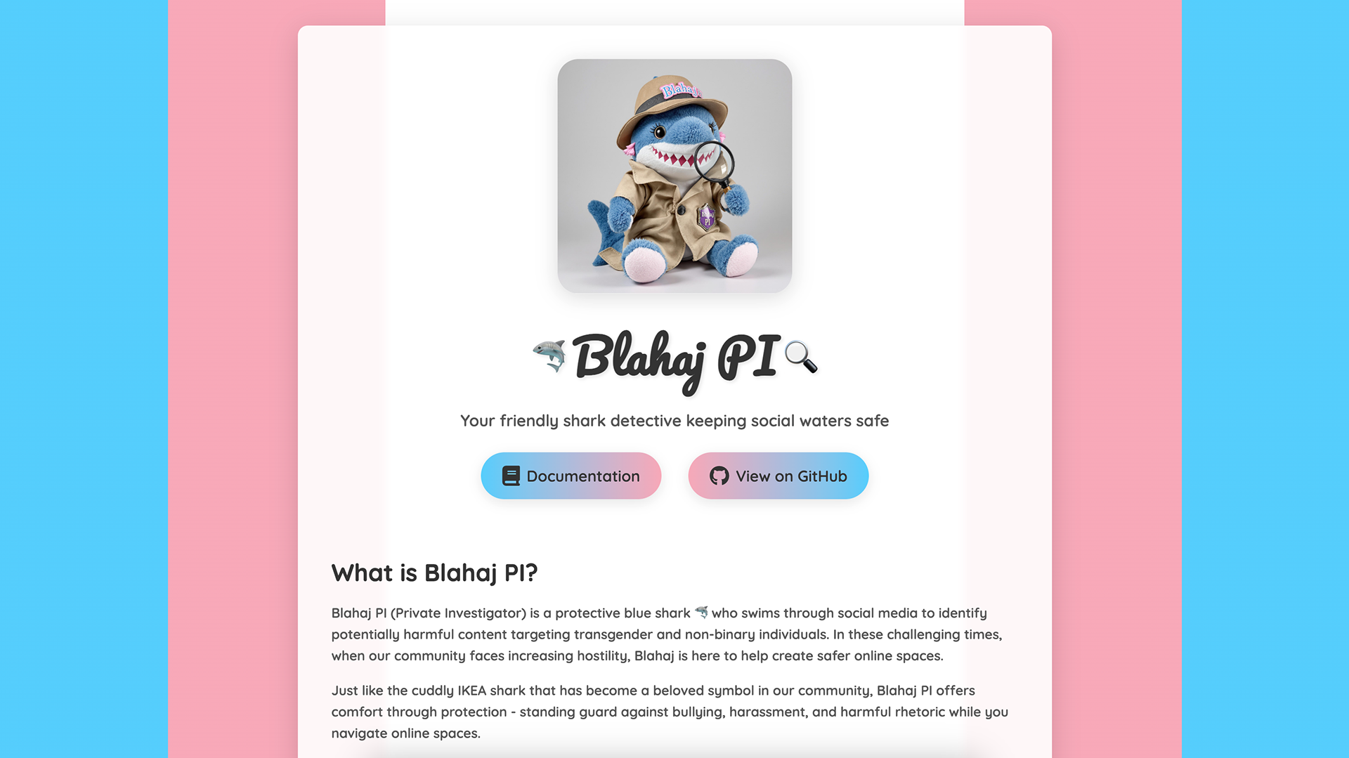 Christi developed Blahaj PI, a C++23 machine learning command line interface (CLI) to identify and filter harmful content targeting transgender and non-binary individuals. The project leverages Neural Networks for Natural Language Processing (NLP) sentiment analysis to enable content classification and visualization tools, including a dynamic word cloud, for deeper insights into online discourse. With a focus on performance, accuracy, expandability, and collaborative development, Blahaj PI features configurable models, batch processing capabilities, and detailed confidence scoring for content evaluations. The project is actively evolving, with plans to expand real-time social media scanning and improve accessibility for broader community use.